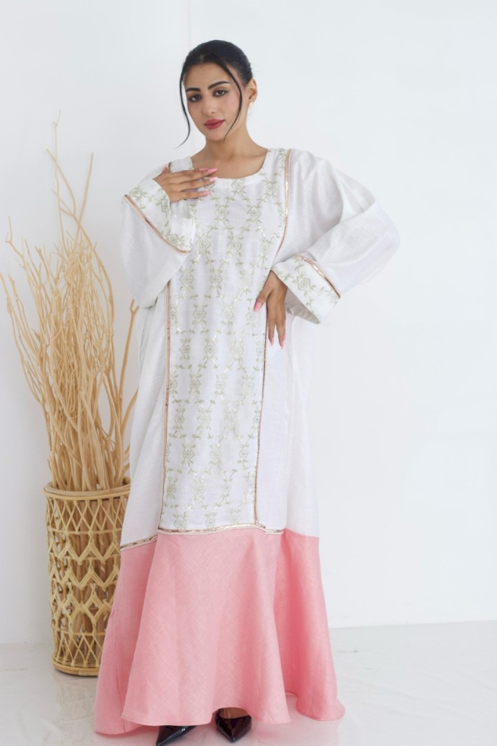 صناعة بحرينية، المصممة حصة بودهيش - قماش الشيفون الحرير، حاشية ملونة، مبطن - الرقبة الاكمام مزين بشريط مشكوك بالخرز ومطرز - الامام شريط من الكور الفضية.